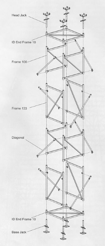 The entire system consists of only five components enabling highly load-resistant support towers to be built to any desired height. These are the frame in two sizes (100 and 133 cm tall), the head and base jacks, the end frame and the diagonals for bracing. Since its design principle is absolutely logical, laborers who have never used this system get along with it well from the outset.